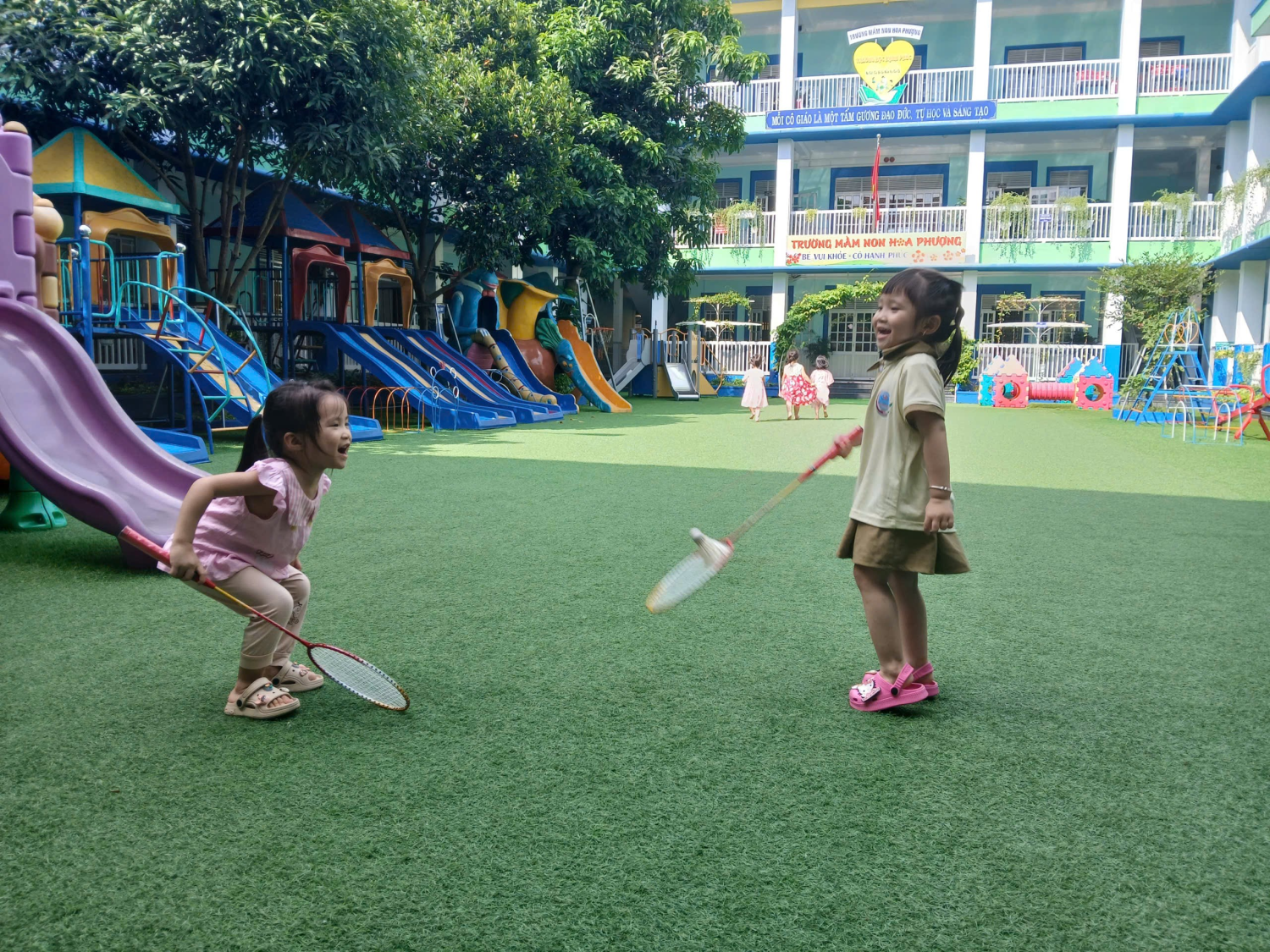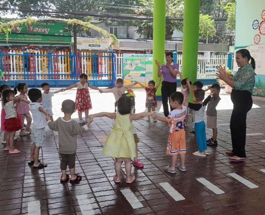 Hoạt động ngoài trời là khoảng thời gian yêu thích của các bé trong ngày. Khi được ra sân chơi, các con có thể chạy nhảy, chơi cầu trượt, xích đu, hay tham gia các trò chơi vận động cùng bạn bè. Dưới ánh nắng nhẹ và không khí trong lành, các bé được cùng nhau ra vườn quan sát rau mồng tơi đang nảy mầm. Các con chăm chú nhìn những chiếc lá non xanh mướt, thân cây nhỏ bé vừa nhú lên từ mặt đất. Qua đó, trẻ học cách nhận biết sự phát triển của cây, biết yêu thiên nhiên và chăm sóc cây xanh. Hoạt động này giúp các bé rèn luyện khả năng quan sát, ghi nhớ và hình thành thói quen yêu thích khám phá thế giới xung quanh.
