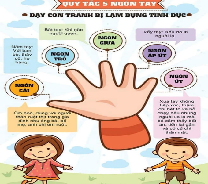 | Tiếp theo ngón cái là ngón trỏ. Ngón này tượng trưng cho những đối tượng mà các bé thường hay gặp gỡ, sau những người thân trong gia đình. Đó là thầy cô, bạn bè và người thân họ hàng. Với những người thuộc nhóm này, ba mẹ dạy con chỉ được nắm tay, khoác vai và chơi cùng. Tuyệt đối không có các hành động ôm hôn, sờ hoặc chạm vào các vùng riêng tư. |
