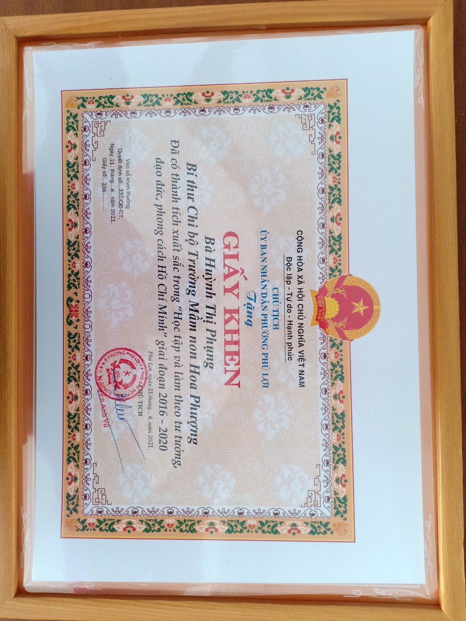 UBND phường Phú Lợi tặng giấy khen cho tập thể Chi bộ MN Hoa Phượng và 01 cá nhân đã có thành tích xuất sắc trong "Học tập và làm theo tư tưởng, đạo đức, phong cách Hồ Chí Minh" giai đoạn 2016-2020 theo Quyết định số 337/QĐ-CT, ngày 11/6/2021
