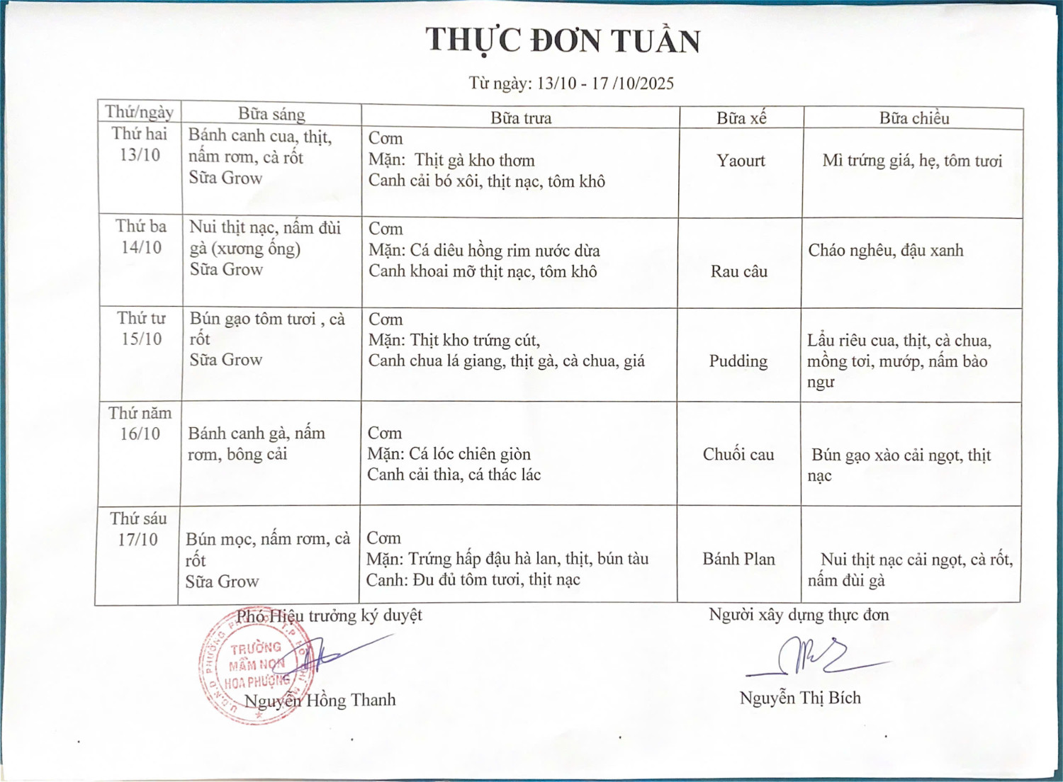 THỰC ĐƠN TỪ NGÀY 13/10-17/10/2025