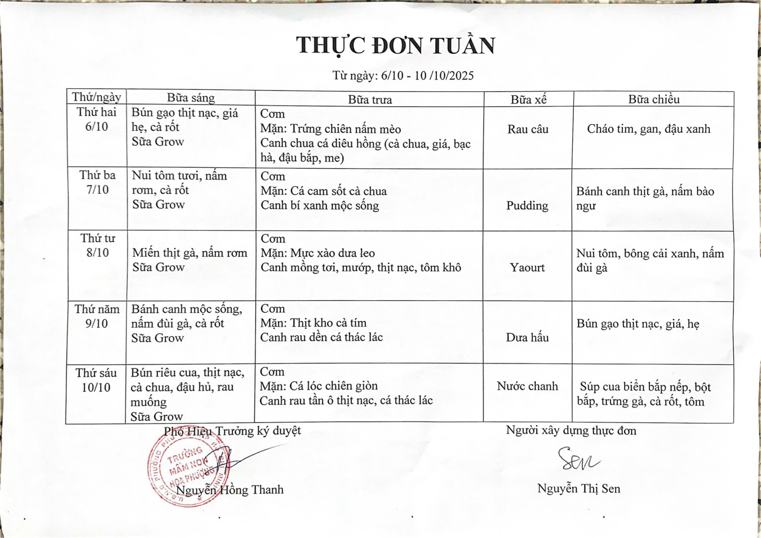 THỰC ĐƠN TỪ NGÀY 6/10-10/10/2025